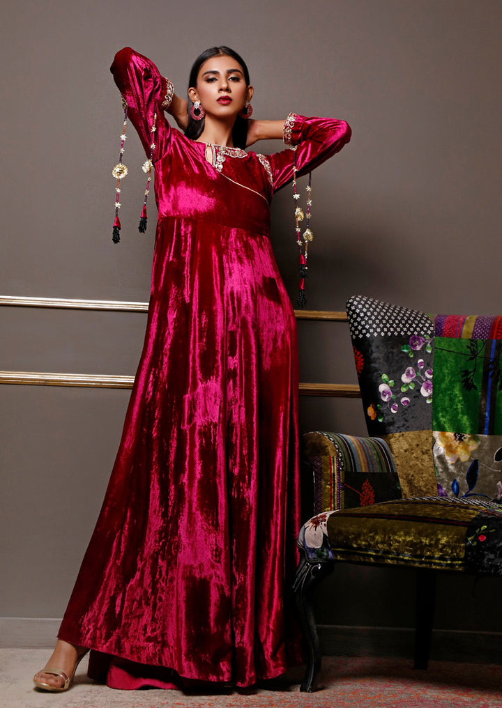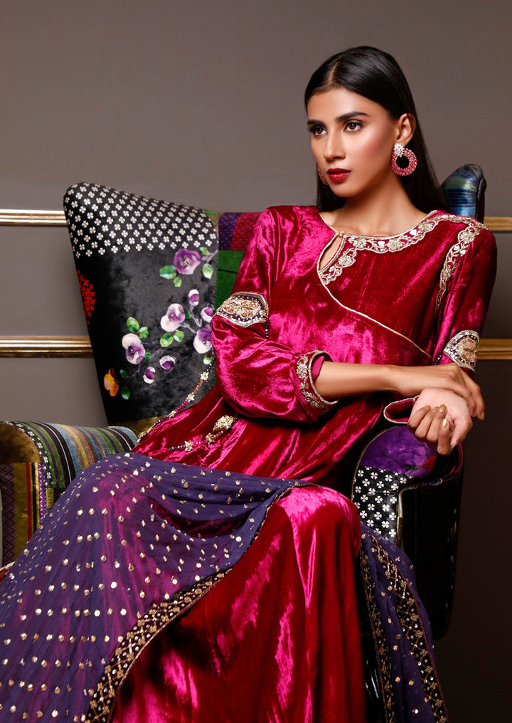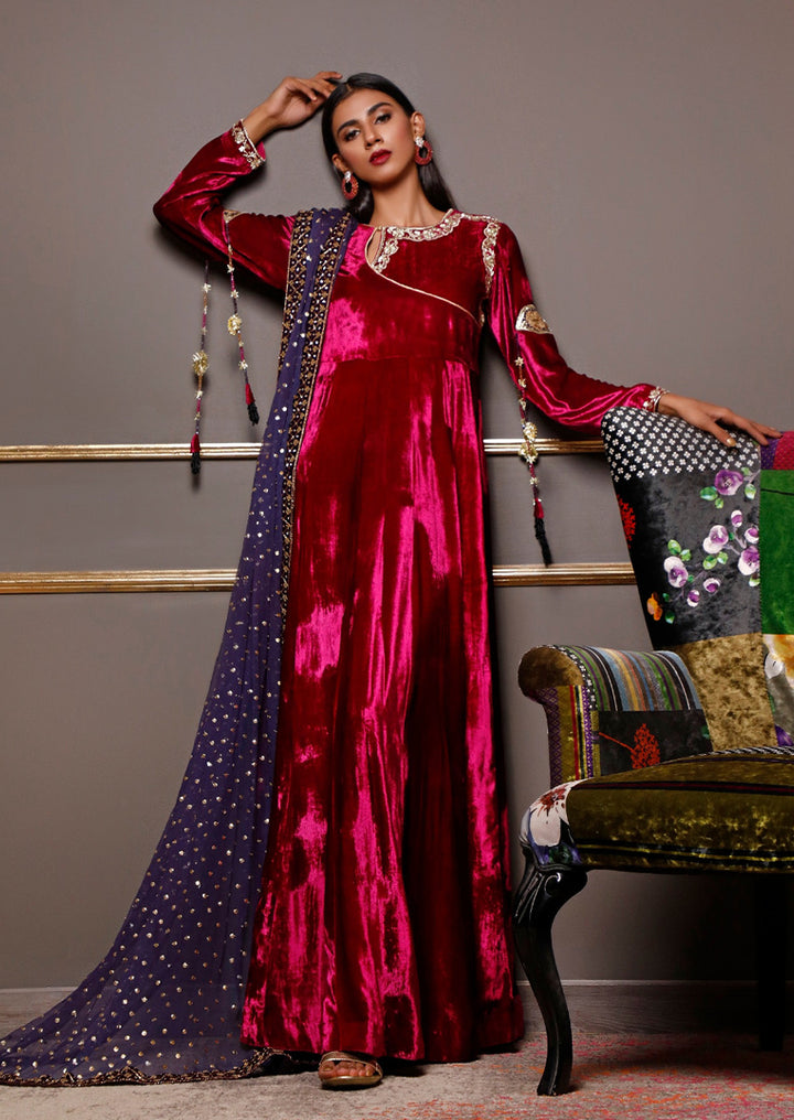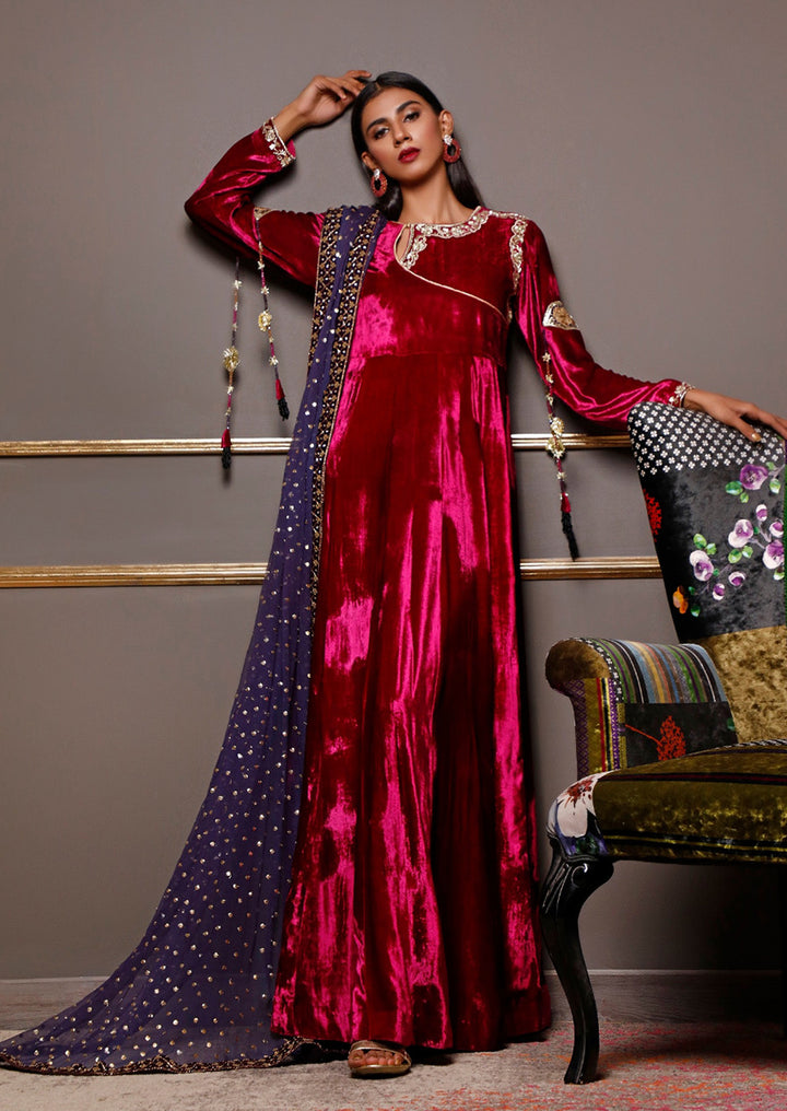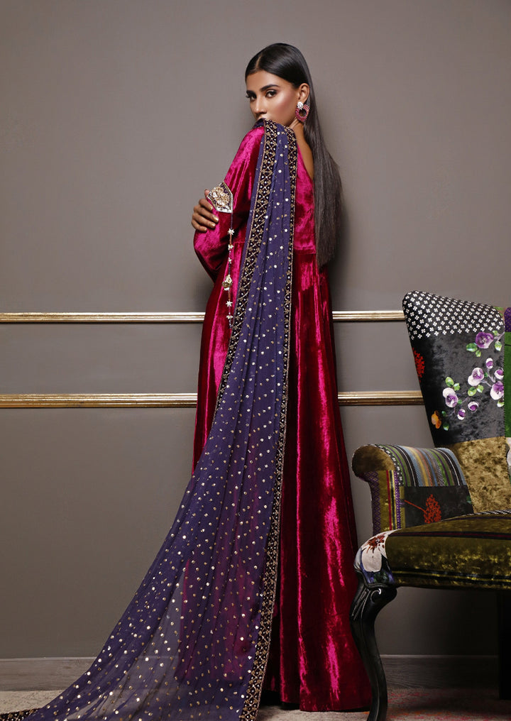 This elegant outfit features a premium velvet gown paired with a heavy handmade dupatta. The rich velvet adds a luxurious, refined look, while the dupatta is adorned with intricate dabka, zardozi, pearls, and sequin detailing crafted by skilled artisans. Together, they create a regal ensemble perfect for winter weddings and formal occasions.