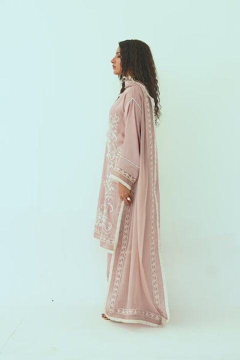 This Pure Sheesha silk shirt is adorned with beautiful embroidery and intricate hand embellishments, paired with matching Shalwar with Embroidery and complemented by a coordinated dupatta for a refined and elegant look.