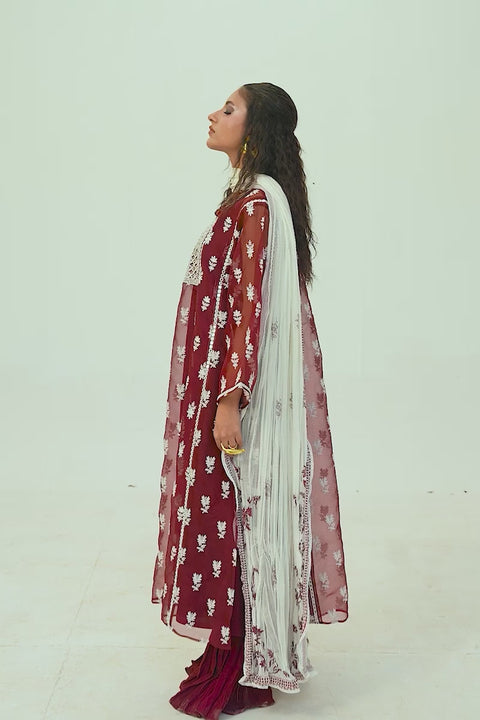 This maroon-colored organza shirt features elegant embroidery, enhanced with intricate Sheesha work and stone embellishments. It is paired with a silk dhaka and a beautifully embroidered matching dupatta, creating a refined and graceful ensemble.