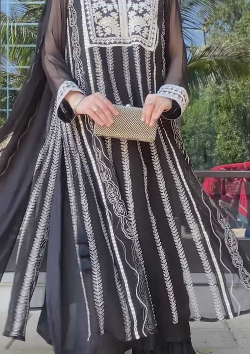 A classic black georgette ensemble featuring a beautifully embroidered shirt, paired with matching pants and a coordinated dupatta. The timeless black hue enhances the elegance and sophistication of this refined outfit.