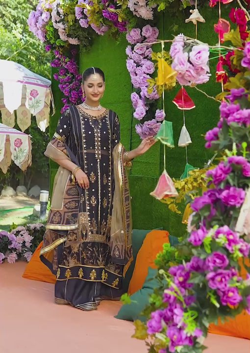 An organza shirt paired with a silk lehenga and organza dupatta, showcasing exquisite hand craftsmanship with gota, naqshi,Tilla, dabka tikky stone & Fancy sequins in a beautifully refined style.