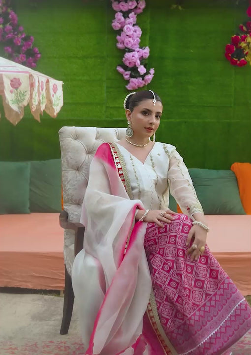An organza shirt crafted in Gharara silk Chundhary-style fabric, adorned with exquisite handwork with naqshi dabka tikky stone & sequins for a sophisticated and graceful look.